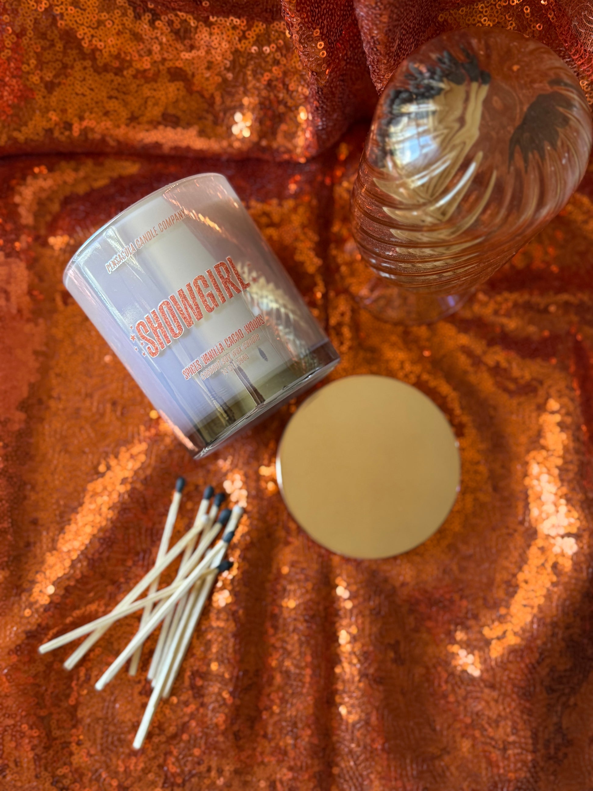 This product is in no way affiliated with, endorsed by, or associated with Taylor Swift, TAS Rights Management LLC, or any of their affiliates. “Showgirl” is an original candle created by Pensacola Candle Company, inspired by our love of music, Taylor Swift, and fragrance artistry. Any reference to Taylor Swift is for descriptive and artistic purposes only.